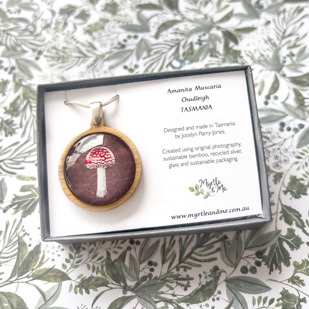 • This pendant/necklace is handmade in Tasmania from sustainably sourced bamboo, recycled silver and glass.